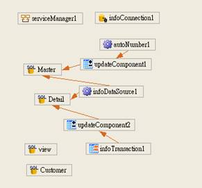 4. InfoDataSource:能整合多個 InfoCommand 來構成 Master/Detail 多層的關係,並能一起控制一起存檔等機制(類似 Delphi 的 MIDAS 來設計),其有下列幾個特色: