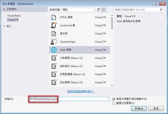 回到VS上,在JQWebClient的資料夾下面新增一個頁面,資料夾上右鍵-->加入-->加入新項目。
