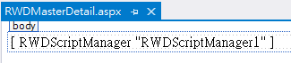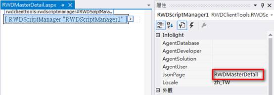 Step24> 設置完成後,點擊上方的【保存】按鈕,接著我們回到VS上,打開前面做的RWDMasterDetail表單,設置RWDScriptManager元件的JsonPage屬性為RWDMasterDetail