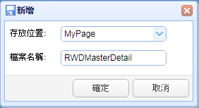 按下新增,添加一個Json檔案,我們會將設計的頁面存成JSON格式,檔案存放的位置,需要跟您放置RWDMasterDetail表單的位置一致,在此我們下拉選擇MyPage,檔案名稱可以自由命名,在此我們命名成跟表單名稱一樣:RWDMasterDetail,方便辨識。