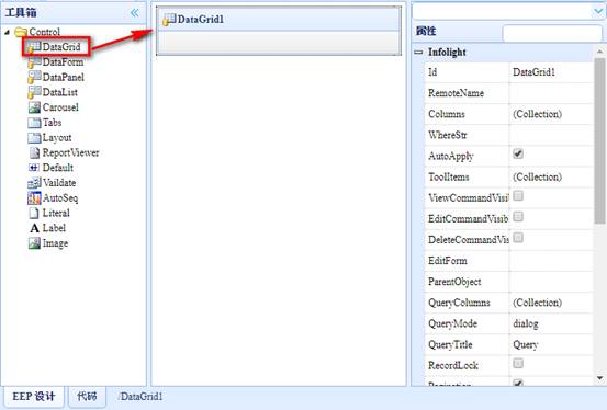 Step20> 有了資料來源後,透過DataGrid2的Columns屬性,可以添加欄位至DataGrid上做為顯示欄位,或者也可以從工具箱裡用拖拉欄位的方式加入,這裡我們先添加幾個欄位。