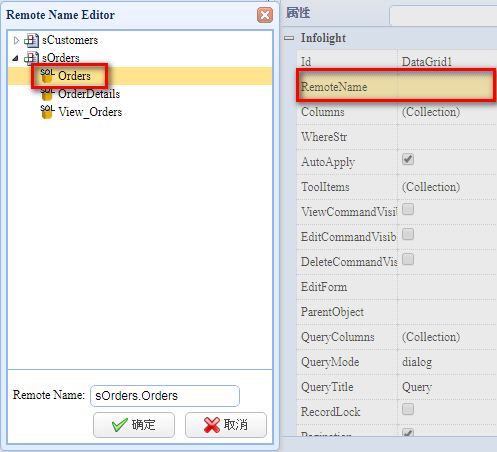 Step10> 接著設定DataGrid的資料來源RemoteName屬性為sOrders.Orders。