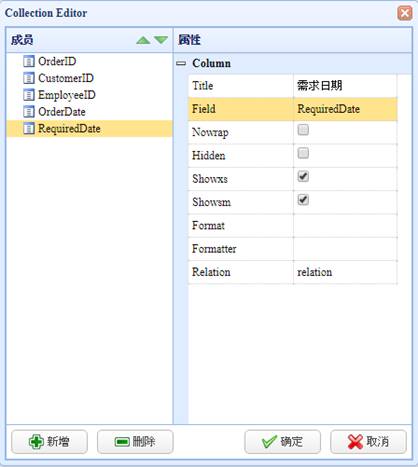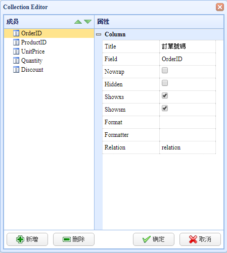 Step11> 有了資料來源後,透過DataGrid的Columns屬性,可以添加欄位至DataGrid上做為顯示欄位,這裡我們先添加幾個欄位。