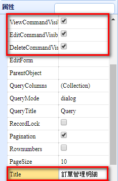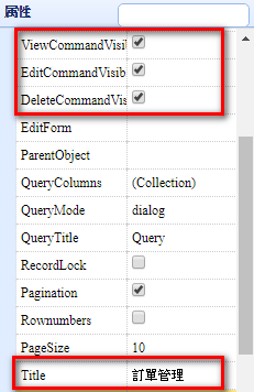 Step12> 將DataGrid的ViewCommandVisible、EditCommandVisible、DeleteCommandVisible屬性勾選,使之可以做預覽、修改、刪除的動作,並且給DataGrid一個標題:訂單管理。