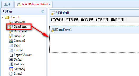 Step14> 從工具箱上拖拉一個DataForm至元件設計區上。