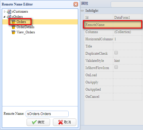 Step15> 設定DataForm關聯主檔的資料來源RemoteName屬性為sOrders.Orders。