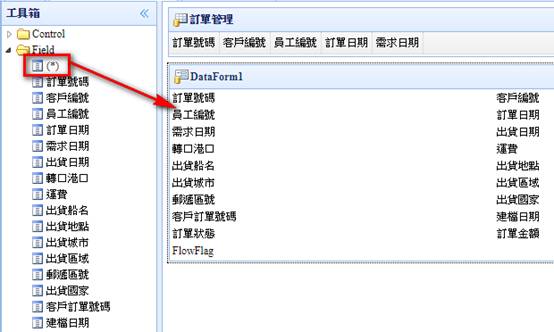 Step16> 有了資料來源後,透過DataForm的Columns屬性,可以添加欄位至DataForm上做為編輯欄位,也可以直接從工具箱裡面將欄位拖拉至DataForm元件中。