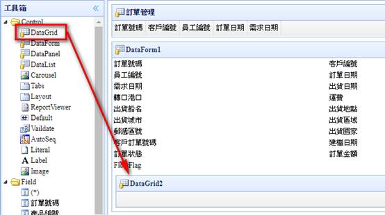 Step18> 接著我們再從工具箱裡拖拉一個要關聯明細檔的DataGrid元件至DataForm裡面。