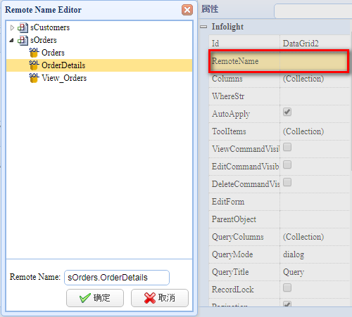Step19> 接著設定DataGrid2的資料來源RemoteName屬性為sOrders.OrderDetails。