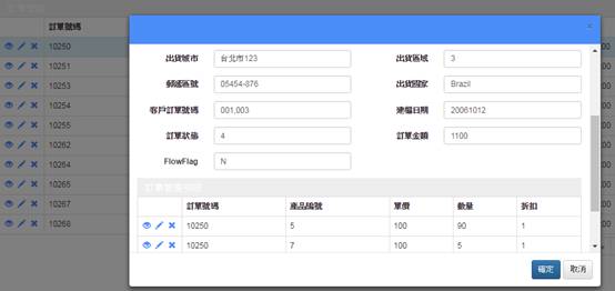 Step21> 將DataGrid2的ViewCommandVisible、EditCommandVisible、DeleteCommandVisible屬性勾選,使之可以做預覽、修改、刪除的動作,並且給DataGrid2一個標題:訂單管理明細。
